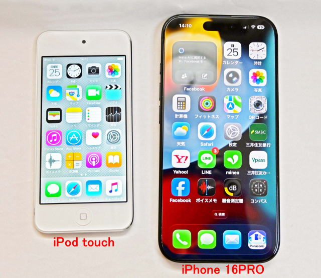| 朝夕の散歩はイヤーホンで音楽を聞きながら歩いている。音源はCDで、曲はクラシックやバロックやPOPsなどいろいろ。今まで、パソコンのディスクドライブにCDを入れ、アップルのiTunes(アプリ)で読み込み、iPod nanoと同期し、iPod nanoを持ち歩いて聴いていた。最近、イヤーホンが傷んだので新品に交換した。iPod nanoも液晶に黒い細線が何本も出るようになった。経年による劣化が始まっている。この現象は音楽再生には何の悪影響もないが、いつ壊れるか分からない。iPodはすでに販売終了になっているので、ヤフオク等の出品物は全て中古品になる。 iPodには、iPod mini、iPod shuffle、iPod nano、iPod touchというバリエーションがあった。iPodはアップルが2001年に発売した携帯型デジタル音楽プレーヤで、「1000曲をポケットに」というキャッチコピーで2022年まで販売してきた。その間、世代交代を遂げてきたが、スマホの普及でその使命を全うした。しかし、中古市場では今も相変わらず人気がある。 iPod nanoは機能を限定して超薄で小型で胸ポケットに入れても嵩張らない。iPod touchはスマホよりわずかに小型で、薄さはスマホの半分ぐらい。重さはnanoが31g、touchが89g。このiPod touchも胸ポケットにすっぽり入る。 音楽再生機能は両者は同じ、iTunesで同期して使用する。 ![]() 人気はiPod nanoの方があり、中古市場では数千円程度になっている。iPod touchの方が少し安い。 今回は、ヤフオクでiPod touch 32GB 第6世代品を落札した。送料共で1500円弱(定価は29,800円) カメラは8Mピクセル搭載で、写真もビデオも奇麗に撮れる。届いた商品は傷もなく、液晶は明るく新品並み。バッテリーも劣化が少なく、超お買い得品が手に入った。 WiFi、iTunesなど初期設定をし、PCのiTunesに入っている全曲をiPod touchに転送(同期)した。画面が大きいので、操作はしやすい。機能が豊富など実感できるが、音楽を聴くならiPod nanoで十分だ。今朝、iPod touchをポケットに入れて散歩に出かけた。きれいな音質で、オーボエ協奏曲を聞きながら気持ちよく歩いてきた。 iPod touchの紹介 2007年に発売され、スマホから電話機能、シヨートメール(SMS)機能を削除したもので、操作はiPhone(スマホ)に準ずるものだった。 機能的には、 ・音楽の録音・再生機能、カメラ機能、ビデオ機能 ・WiFiを通じて、WEBサイトの閲覧ができる ・インターネット機能がある ・電話、メール機能はない ・その他、スマホに準じる機能が付いている。 下の写真は、iPod touch(左)とiPhone16PRO(右) ホーム画面はよく似ているが、よく見ると電話機能の有り無しが分かる ![]() iPod と iPhone16PROの裏面 ![]() Appleは一連の商品に共通する思想を通しているので、慣れれば使い勝手は大変良い。 しばらく、iPhone16PROとiPod touchの組合せで使ってゆきたいと考えている。 |